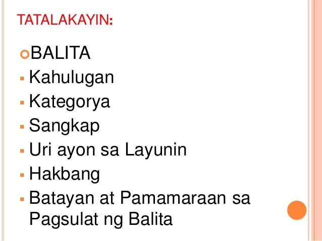 Mga hakbang sa pagsulat ng balita pagsulat ng ulo ng balita katuturan ang pamagat ng isang balita na nagtataglay ng lalong malaking titik kaysa teksto o katawan nito. Mga hakbang sa pagsulat ng balita pagsulat ng ulo ng balita katuturan ang pamagat ng isang balita na nagtataglay ng lalong malaking titik kaysa teksto o katawan nito. Maibahagi sa pamaraang pasalita, pasulat at pampaningin.