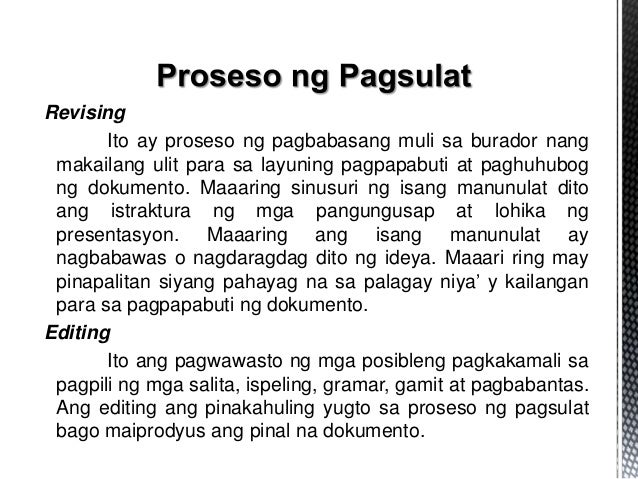 Ang paggsulat ay isang proseso ng pagtatala ng karakter sa isang midyum na may layuning makabuo ng mga salita. Iwasan ang pag gamit ng mga salitang kolokyal o balbal. Nakahuhugot ng mga ideya mula sa mga karanasan;